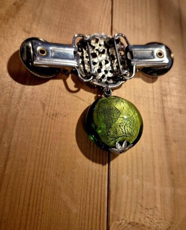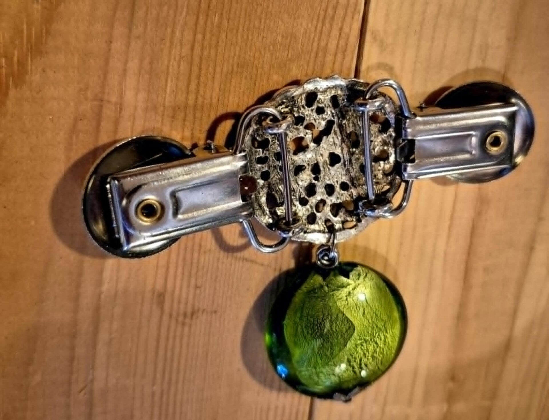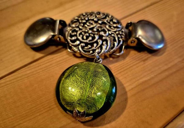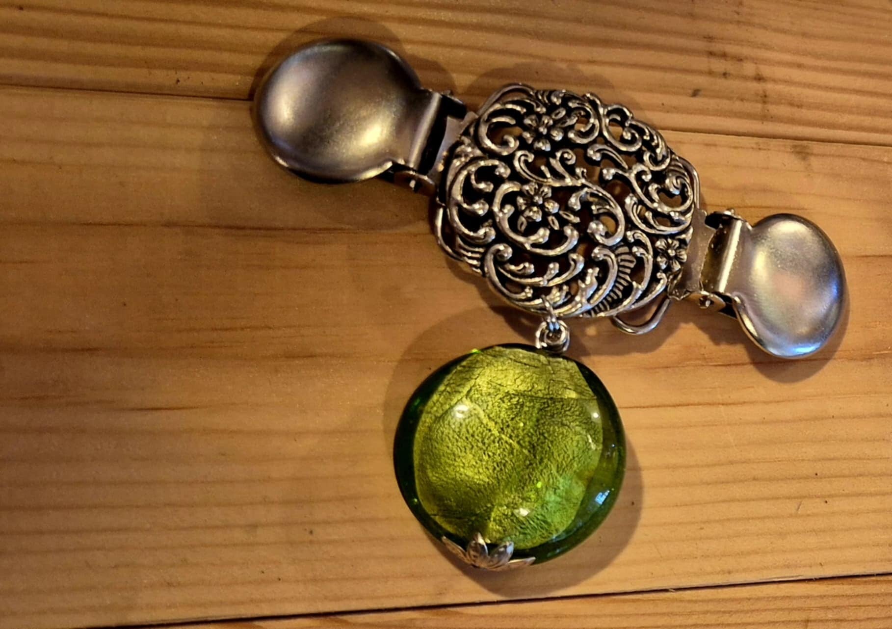 Cette pince à gilet ou foulard permet de garder votre vêtement feremé grace aux deux fixations . Argentée, avec son style fleuri , elle est agrémentée d'1 grosse perle ronde en verre vert avec incrustation de feuille de métal.