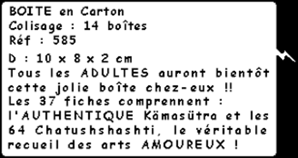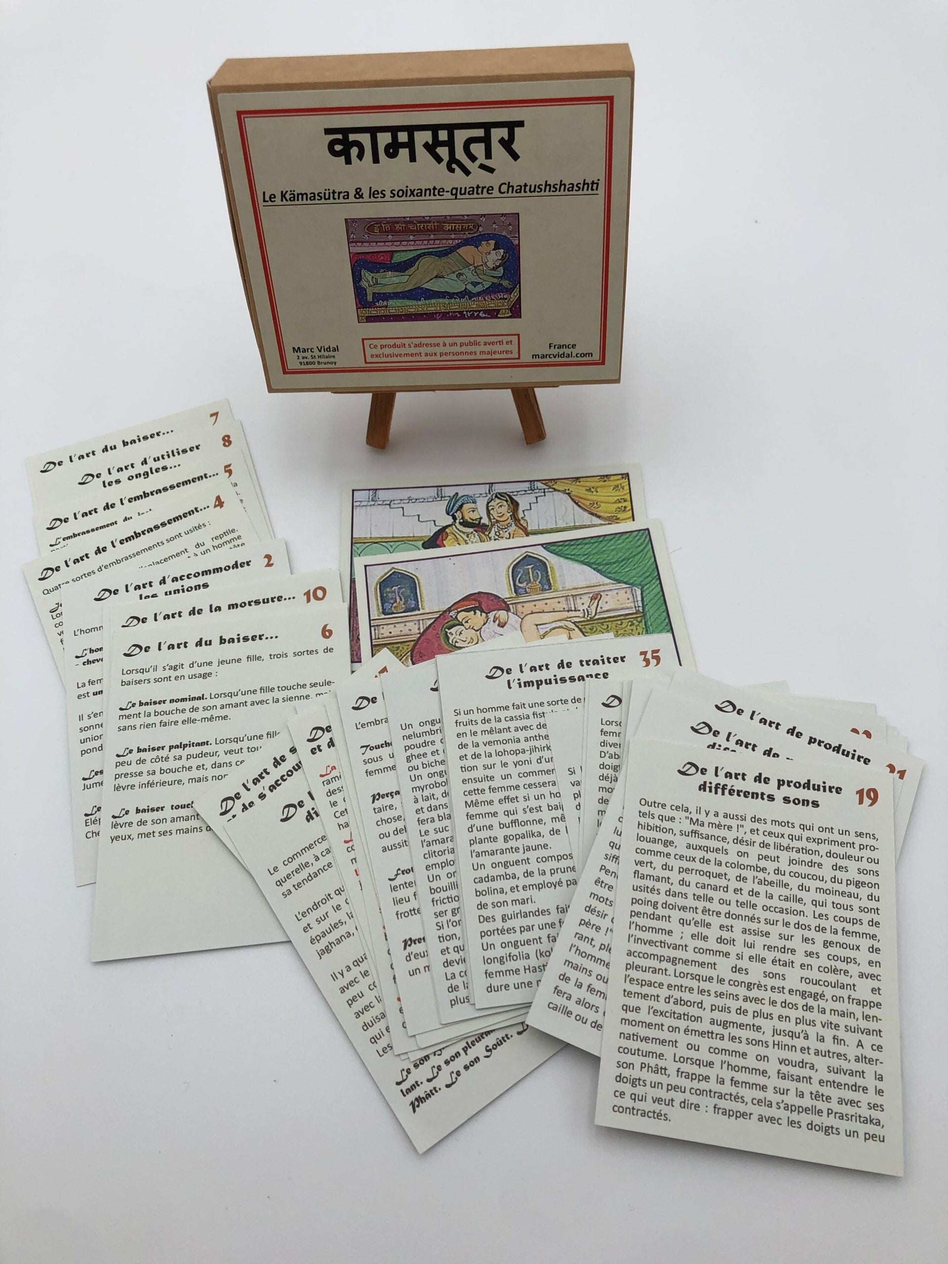 Pour un public adulte averti, cette magnifique boîte sera bientôt chez vous. Elle renferme 37 fiches comprenant l’authentique Kamasutra ainsi que les 64 Chatushshasti, un recueil véritable des arts amoureux. Explorez ces trésors anciens pour enrichir votre compréhension des plaisirs et des relations intimes dans une présentation authentique et détaillée.
