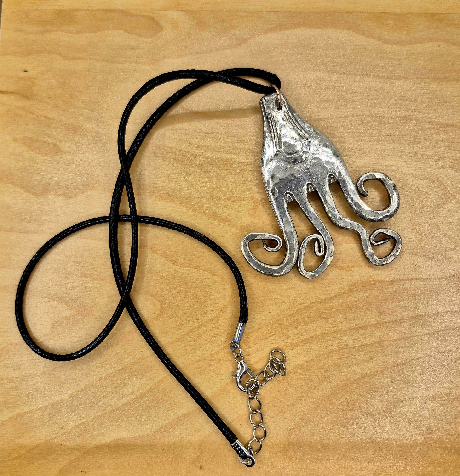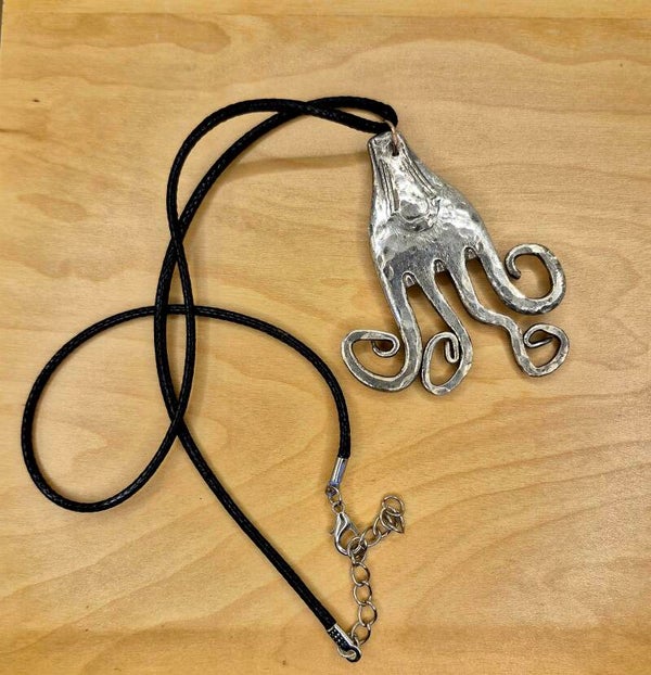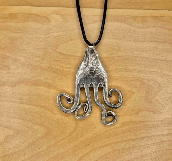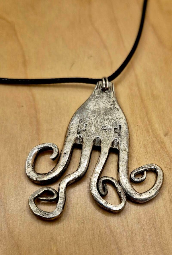 2 finitions différentes pour les 2 côtés de cette fourchette d'argenterie montée sur un cordon de cuir ciré. Un petit bout d'histoire à porter au cou, une pièce unique créer à la main et à la passion!