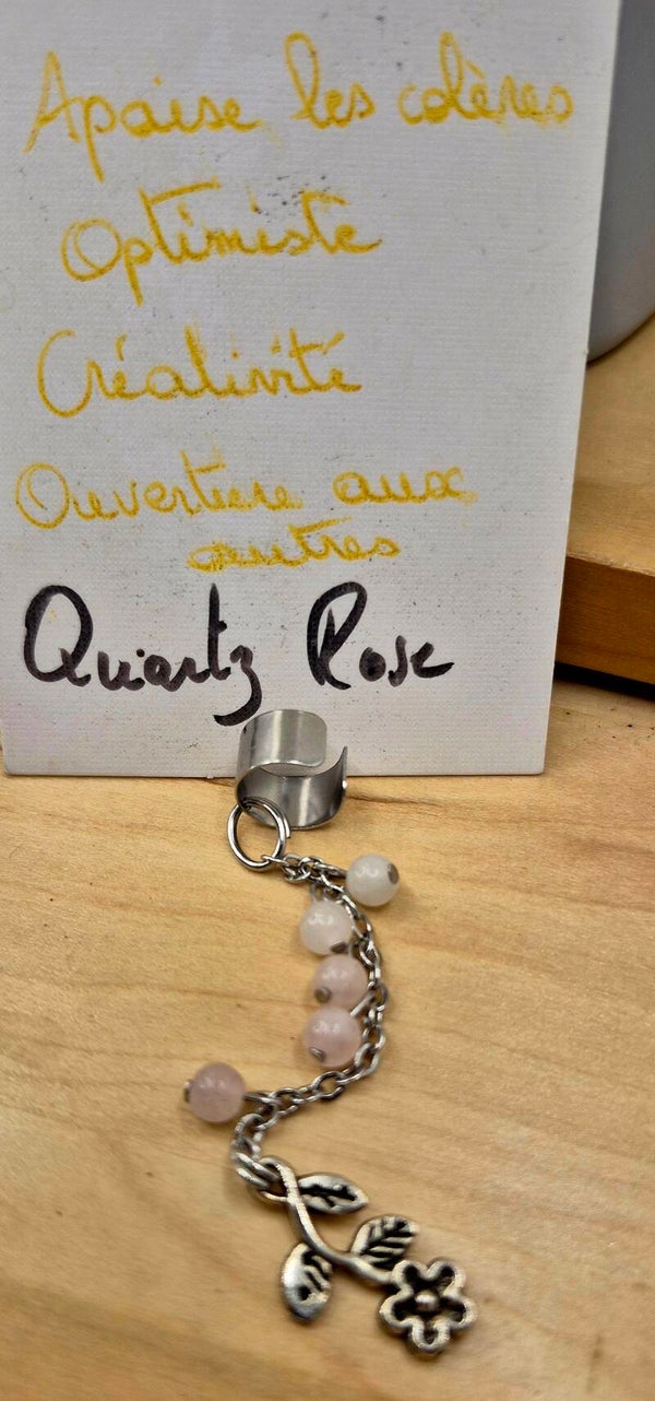Bague d'oreille en acier inoxydable , sur la chaîne on trouve 5 perles en uartz rose et une petite fleur en métal vient terminer le bijou