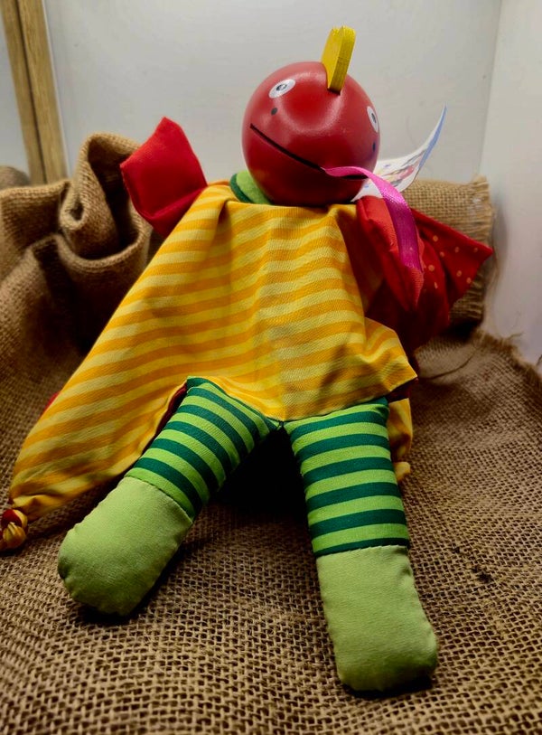 Tête en bois, corps en tissus et longue langue pour ce joli dragon raconteur d'histoires épiques!