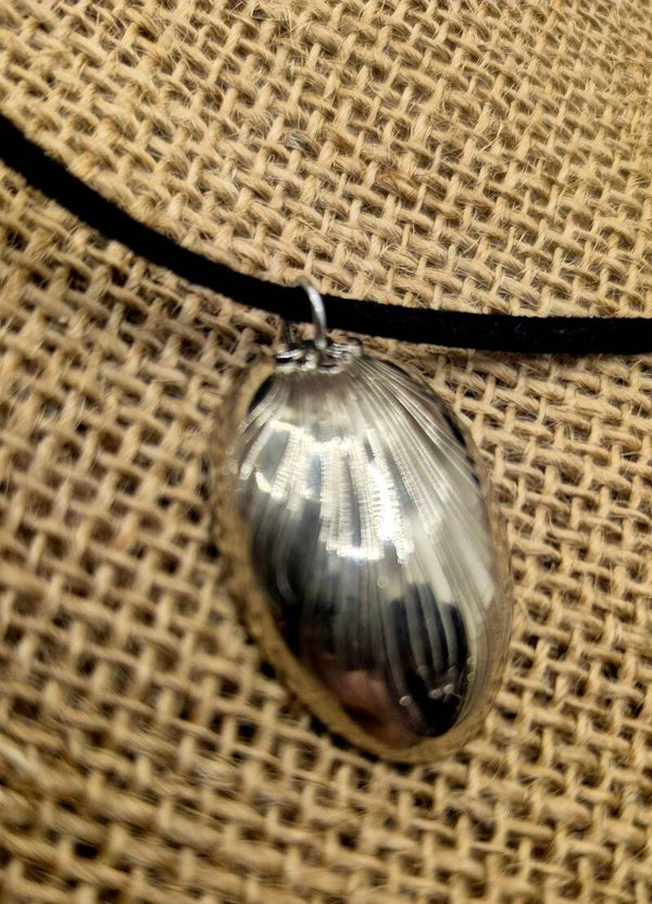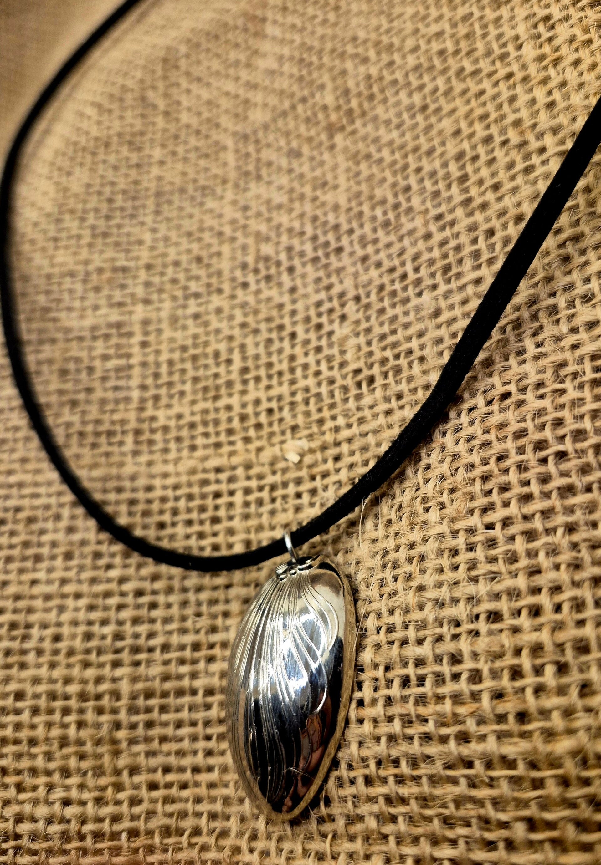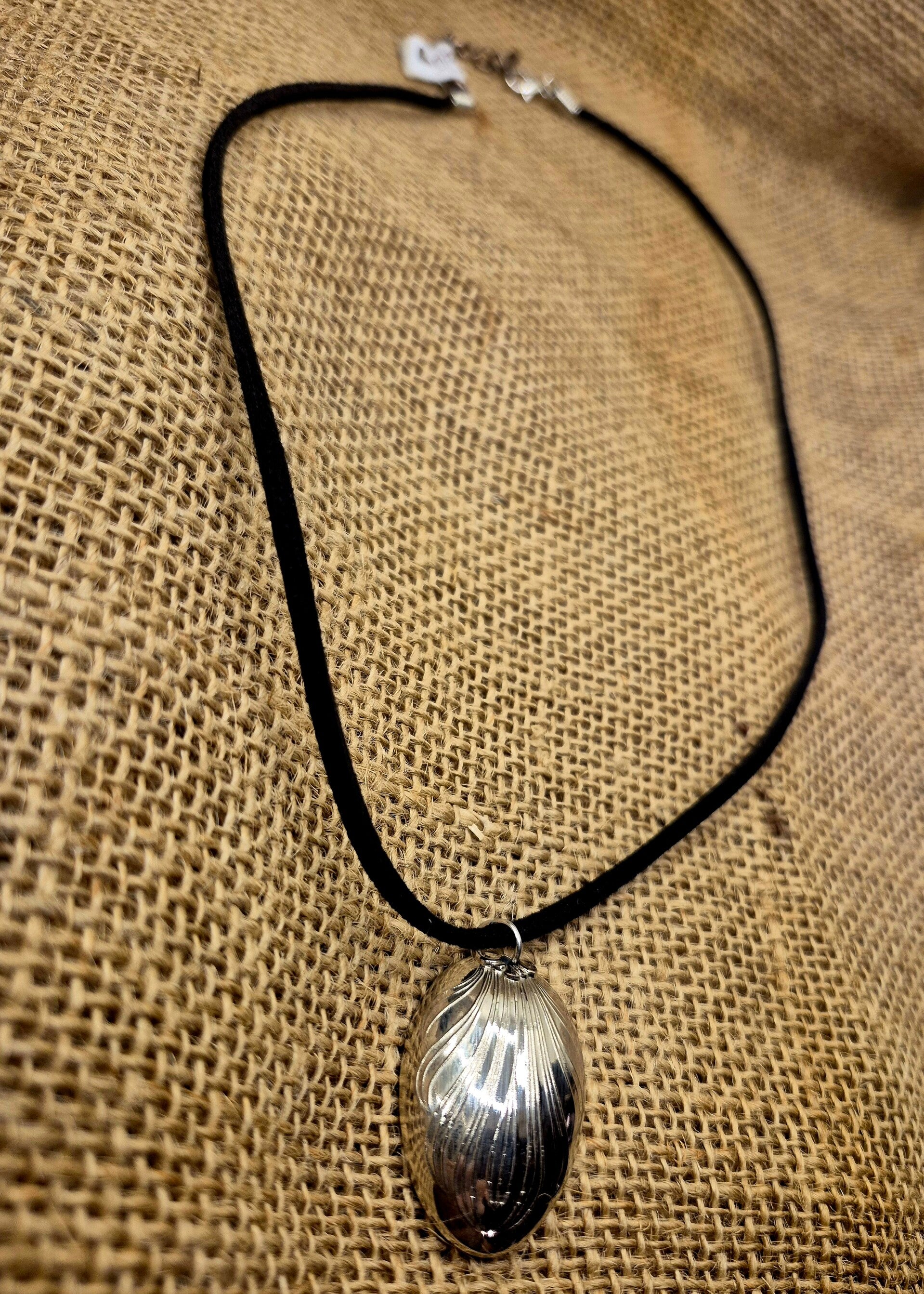Cuillère en métal argenté avec arabesques détournée pour devenir ce jolis collier éclatant et unique dans un esprit recup et un petit côté Art Déco. +-3cm de haut . Cordon en dain noir ajustable