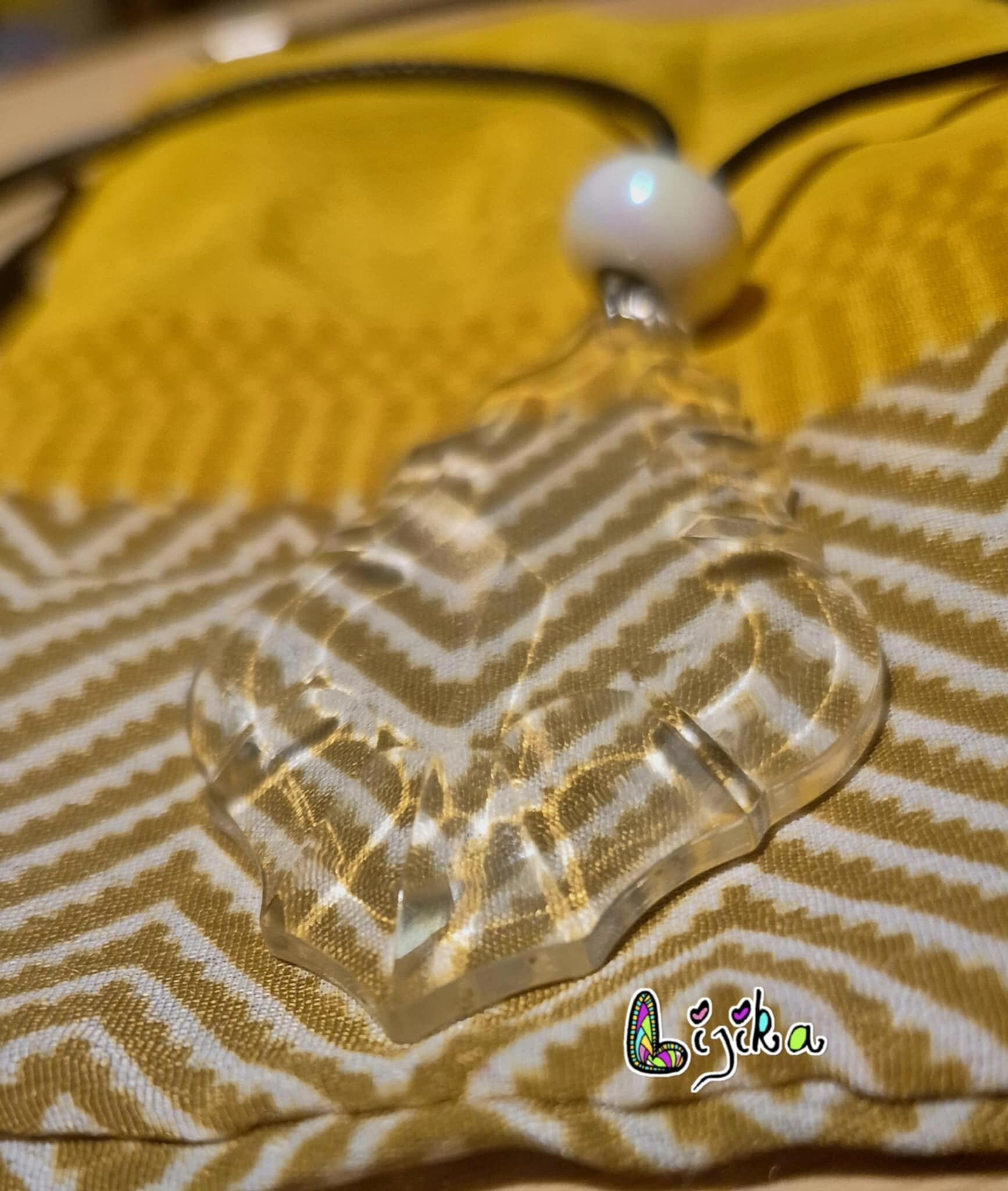 Êtes vous une lumière? Collier upcyclé pampille de lustre... verre, reflet et originalité pour cette pièce unique +-6cm de haut pour le bijoux , perle nacrée en résine sur cordon cuir ciré
