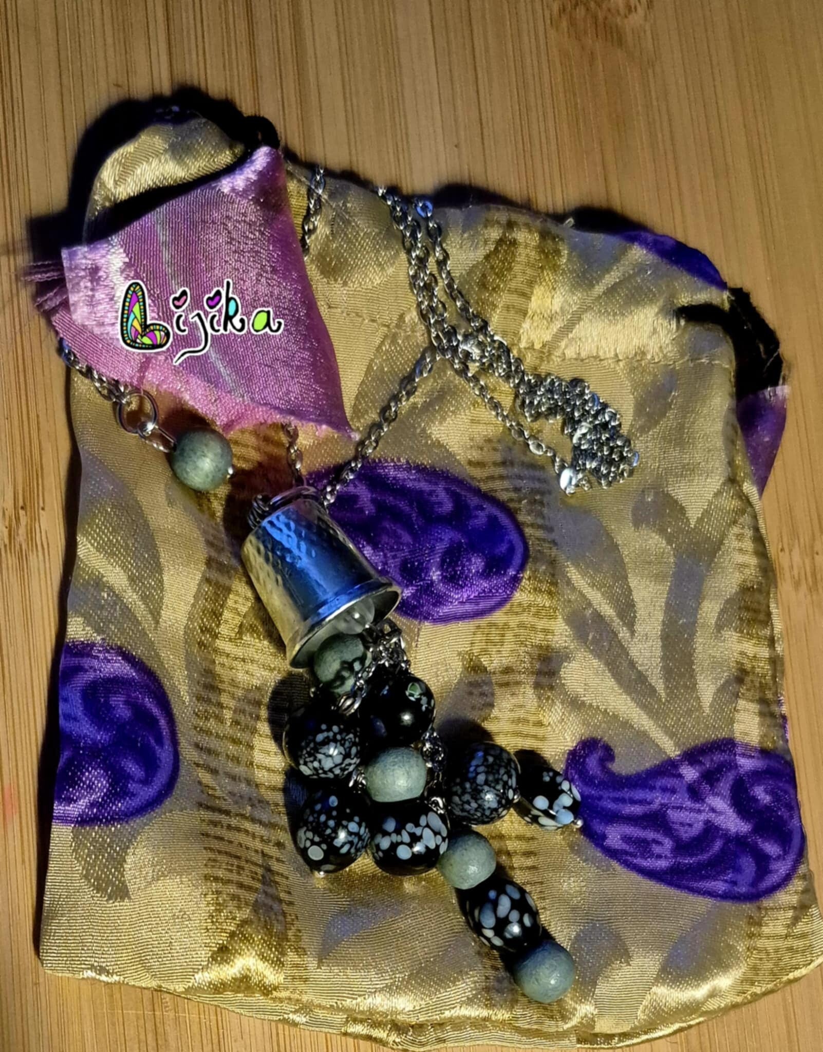 Ce sautoir unique est une véritable œuvre d'art, alliant vintage et modernité. Il est fabriqué à partir d'un ancien dé à coudre, symbole de savoir-faire et d'histoire, réinventé pour créer une pièce originale. Des perles en verre chinées viennent sublimer ce pendentif, apportant douceur et élégance à l'ensemble. Chaque détail a été minutieusement travaillé pour offrir une touche d'authenticité et de raffinement. Ce sautoir est idéal pour celles et ceux qui cherchent à porter un bijou chargé de sens et d'histoire, tout en restant résolument tendance.